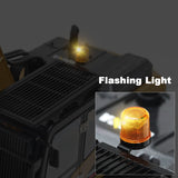 Cab & body details: opening doors and flip-open engine cover; added protective mesh/guard on cab windows; roof beacon / running light.